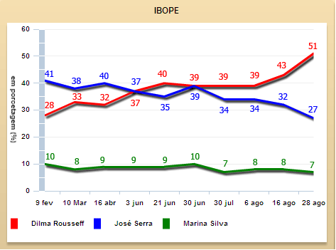 Dilma abriu vantagem de 24 pontos de seu principal adversário, o candidato do PSDB, José Serra e chegou a 51% das intenções de voto, um crescimento de oito pontos porcentuais em relação ao levantamento anterior do mesmo instituto, feito às vésperas do início da propaganda eleitoral, no dia 16 deste mês.