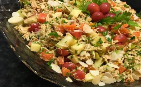 Misture todos os ingredientes do salpicão em uma tigela, menos as lâminas de amêndoas.