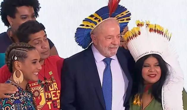 Sônia Guajajara ressaltou a importância da história ancestral dos povos indígenas no país. “O quanto esse momento é significativo para mim e para os povos indígenas do Brasil”, destacou. A ministra fez questão de ressaltar que os povos indígenas não são nem a imagem romantizada nem uma imagem muitas vezes demonizada que circula na sociedade, mas são diversos povos plurais. “Se é verdade que muitos de nós resguardam modos de vida que estão nos imaginários da população brasileira, é importante lembrar que temos muitas formas de vidas diferentes.”
