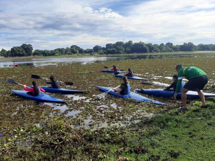 As crianças do Projeto Pelotão Esperança estão participando todas as terças-feiras, no período matutino, de aulas de Canoagem, no Parque Municipal da Lagoa Comprida.