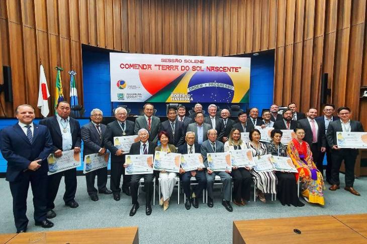 Japoneses e seus descendentes foram homenageados durante a Sessão Solene de Outorga da Comenda do Mérito da Comunidade Japonesa “Terra do Sol Nascente” da Assembleia Legislativa. O evento, realizado na noite de quarta-feira, 28, também comemorou os 115 anos da imigração japonesa no Brasil e foi presidido pelo deputado estadual Roberto Hashioka (União Brasil).