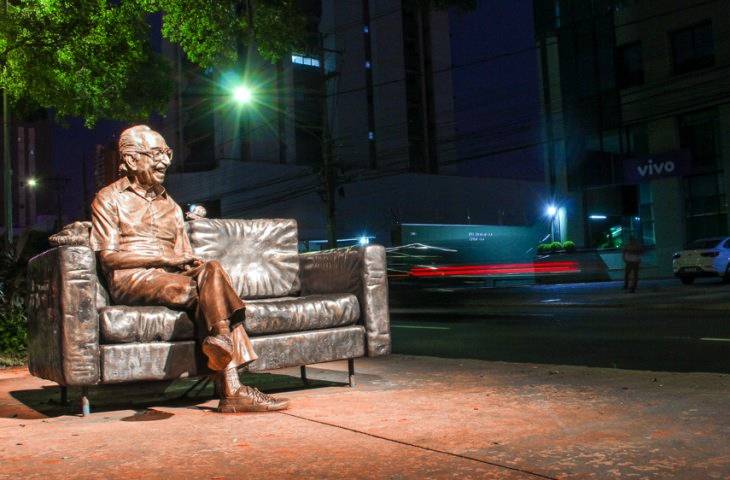 A estátua do poeta Manoel de Barros, que fica na área central de Campo Grande, ganhou revitalização e nova iluminação cênica. Os trabalhos já podem ser vistos pela população. Eles foram realizados pelo artista plástico Ique Woitschach.