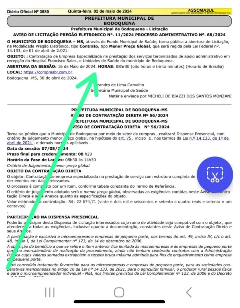 O comunicado sobre abertura de licitação para contração de empresa terceirizada, foi realizado no dia 02 de maio de 2024.