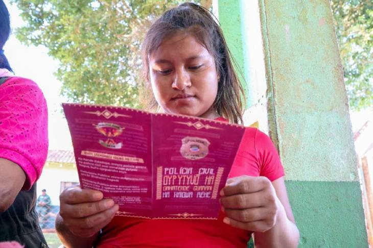 Mulher guarani-kaiowá lê cartilha feita pela Deam na língua materna durante MS em Ação realizado na região de Paranhos – Foto: Divulgação