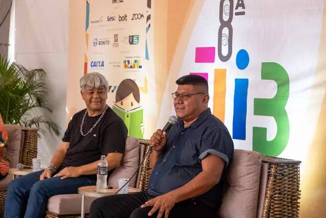 Aronaldo Júnior participa de conversa na Flib com escritor Kaká Wera (à esquerda) – Foto: Elis Regina