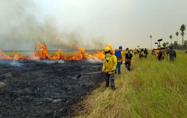 O incêndio no parque nacional Pantanal de Otuquis, fronteira com o Brasil e o Paraguai, está sendo combatido por guarda-parques de outras unidades de conservação da Bolívia – Foto: ANMI San Matías