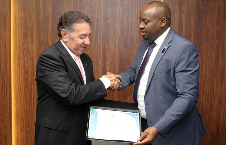 O presidente da Assembleia Legislativa de Mato Grosso do Sul (ALEMS), deputado Gerson Claro, entregou na manhã desta quarta-feira (28) o diploma de Visitante Ilustre ao embaixador de Ruanda no Brasil, Lawrence Manzi, durante visita oficial à Casa de Leis.