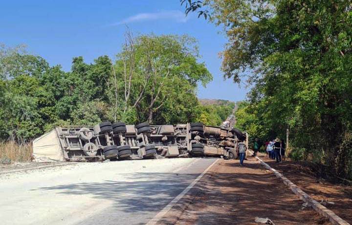 Uma carreta, que transportava cimento, tombou e está atravessada na pista desde 8h15min. Um dos ocupantes saiu ileso e o outro teve lesões leves.
