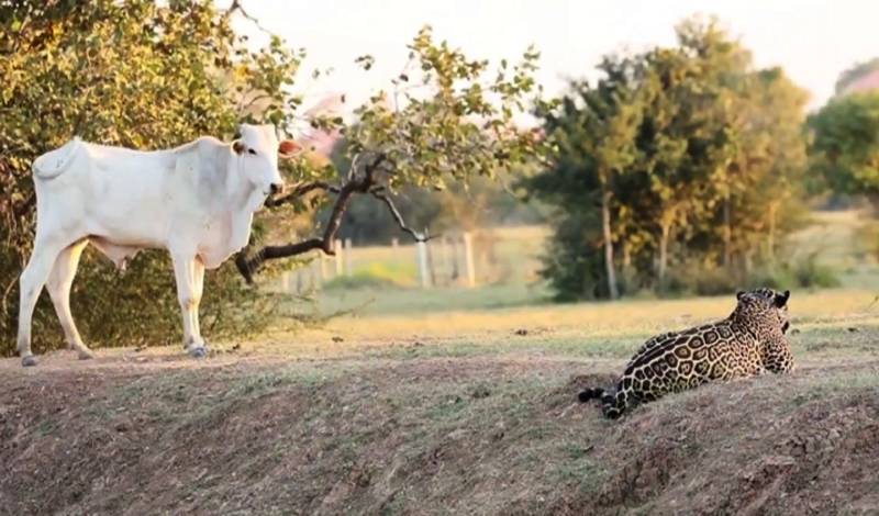 Encontro tenso entre onça-pintada e boi no Pantanal de MS. – Foto: Ilustrativa/Fábio Paschoal