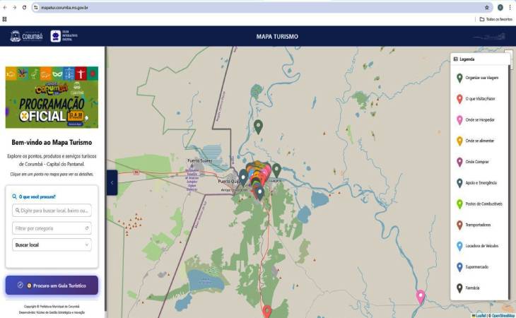 A Prefeitura de Corumbá lançou o Mapa Digital do Turismo, uma ferramenta interativa que reúne, em um só lugar, os principais pontos turísticos, atrativos naturais, culturais e históricos, além de empreendimentos voltados ao atendimento de visitantes e moradores. A plataforma facilita a navegação e o acesso a informações georreferenciadas, proporcionando ao cidadão e ao turista uma experiência prática e segura para explorar Corumbá.