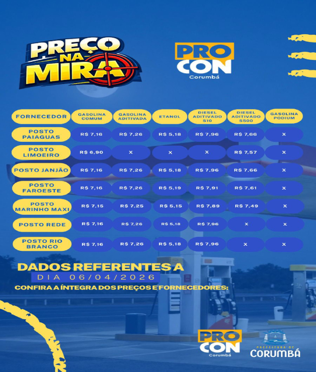 Com a operação “Preço na Mira”, os postos de combustíveis deverão encaminhar diariamente ao PROCON Corumbá os valores praticados para gasolina, etanol e diesel. Essas informações serão organizadas e divulgadas amplamente à população, promovendo o direito à informação clara e adequada, conforme previsto no Código de Defesa do Consumidor.