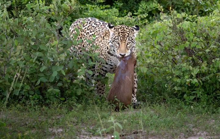O flagra foi feito pela bióloga e fotógrafa Carolina Prange. Na publicação, ela explicou que a onça viu uma movimentação na mata e deu o bote. Logo em seguida, Aracy saiu com um filhote de capivara na boca.